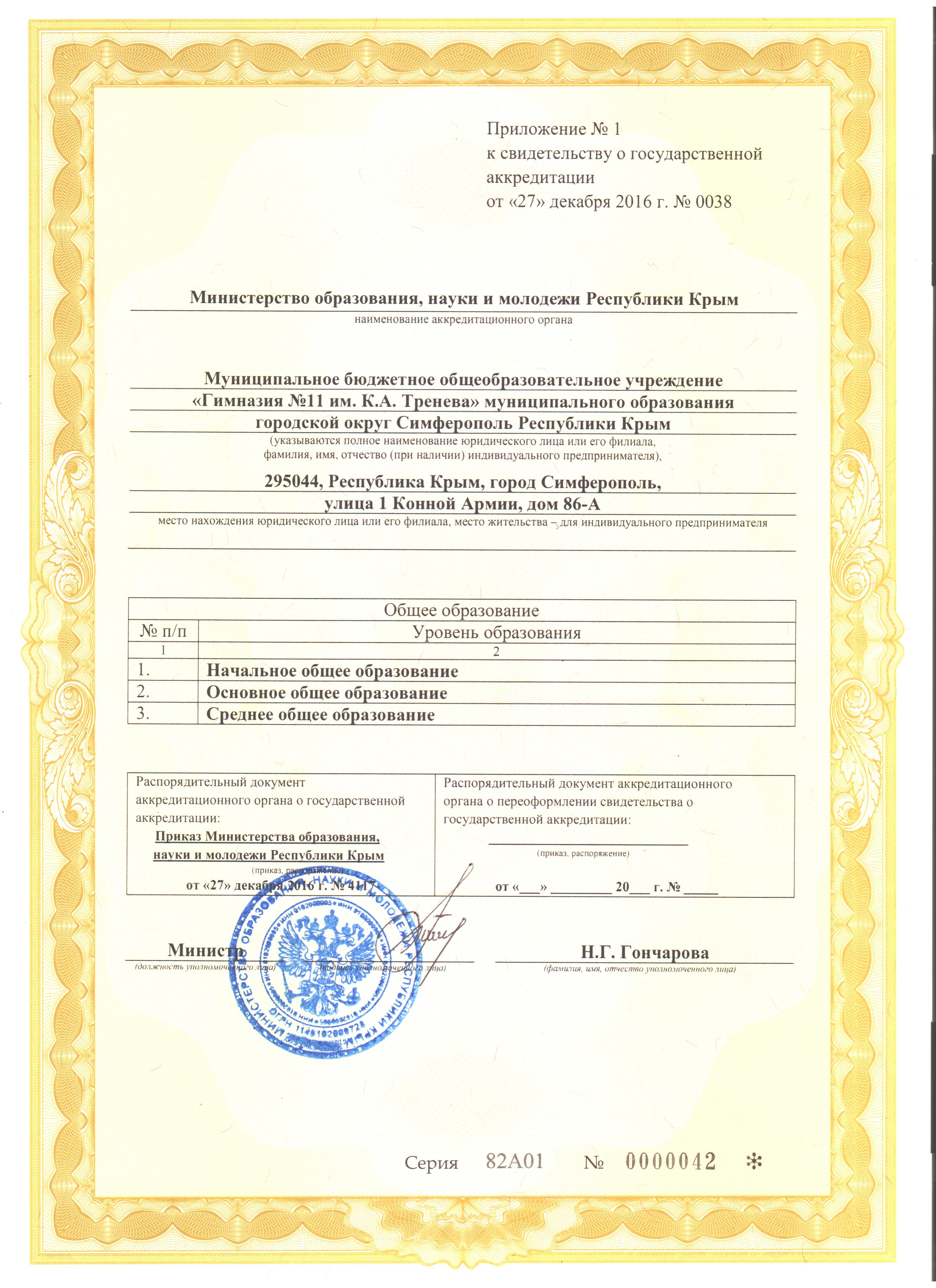 Полное наименование образовательной организации | Муниципальное бюджетное общеобразовательное учреждение «Гимназия №11 им. К.А. Тренева» муниципального образования городской округ Симферополь Республики Крым |